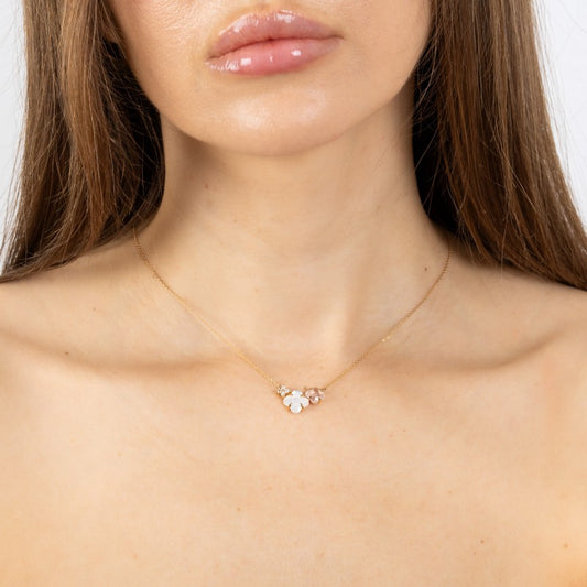 Collier Bouquet quartz rose, nacre blanche or jaune et diamants