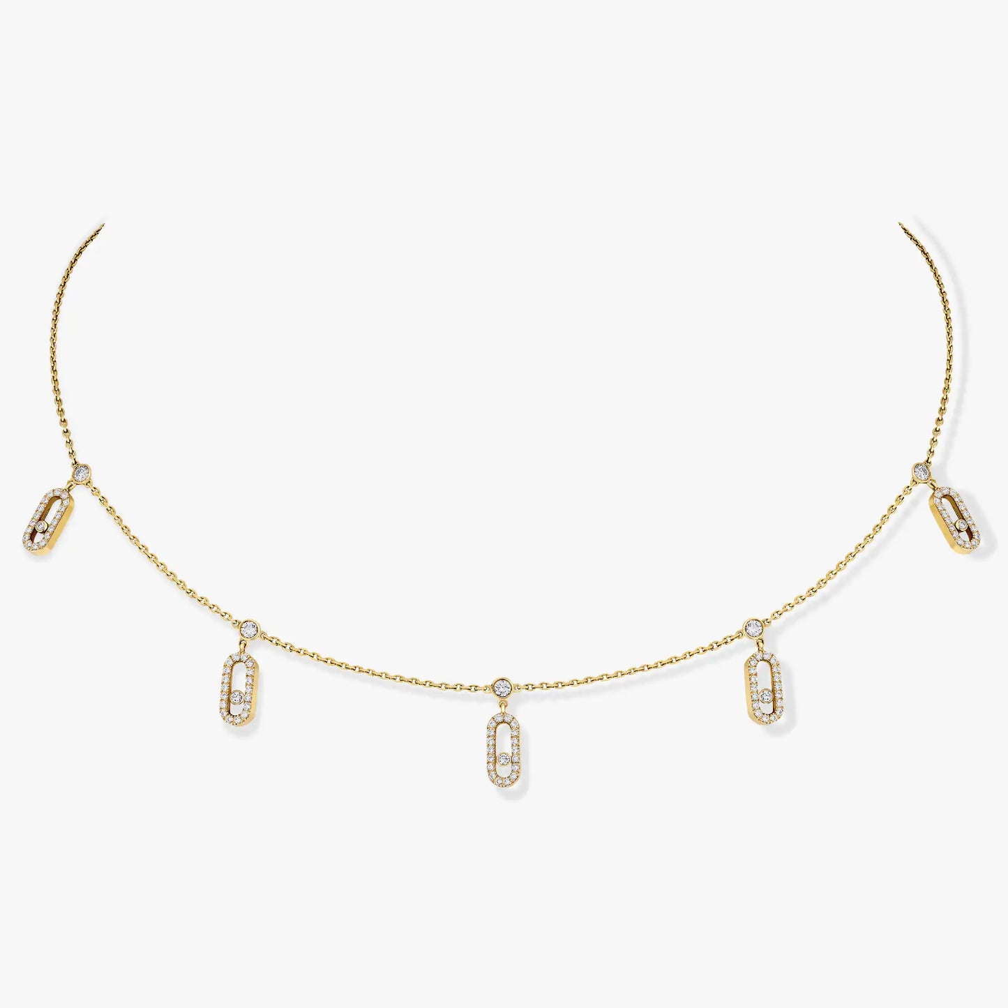 Laissez-vous séduire par le collier Move Uno Pampilles qui se compose d'une fine chaîne retenant 5 charms Move Uno en diamants lumineux. Ode à la lumière et à l'éclat des diamants, on apprécie sa souplesse et le mouvement qui le caractérise. Doté d'un fermoir mousqueton avec système coulissant, vous pourrez le porter en chocker ou en ras du cou.