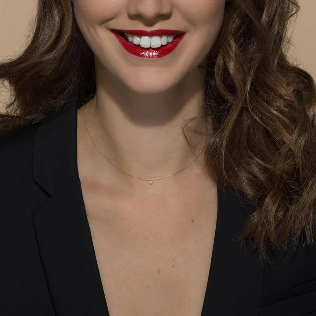 Collier signature de La Brune & La Blonde. Le diamant, ici libéré de son poids d'or, joue merveilleusement avec la lumière. Léger, aérien, délicatement posé sur votre peau, impossible de vous le faire quitter !