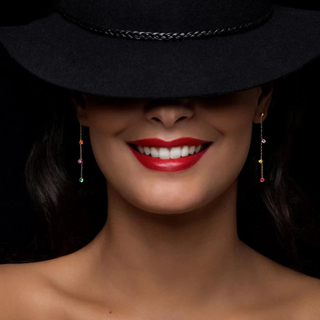 Laissez vous séduire par l’originale asymétrie et l'arc-en-ciel de couleurs de ces pendants d’oreilles qui illumineront votre visage !